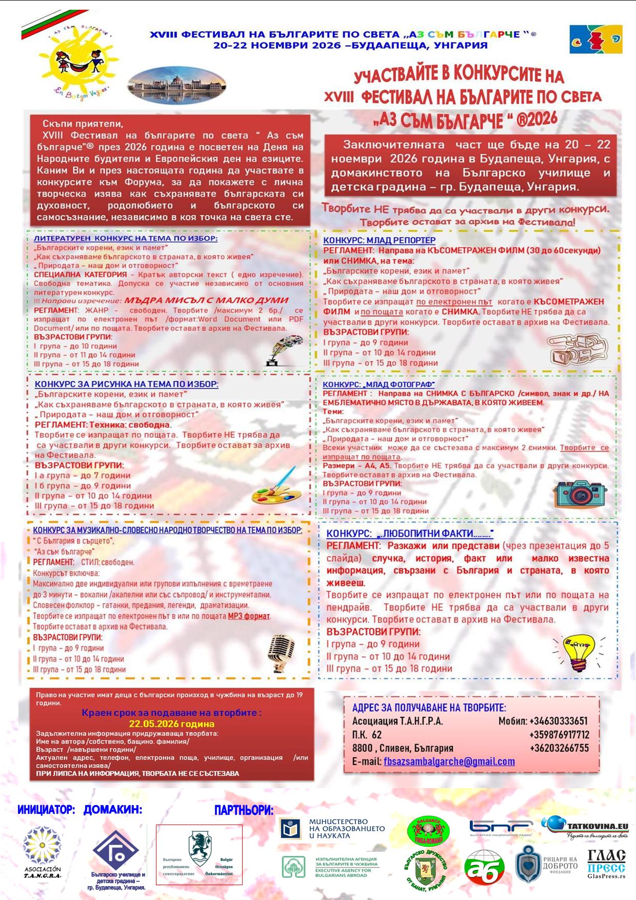Организатор: Асоциация Т.А.Н.Г.Р.А., гр. Сливен; Домакин: Българско училище и детска градина – гр. Будапеща, Унгария